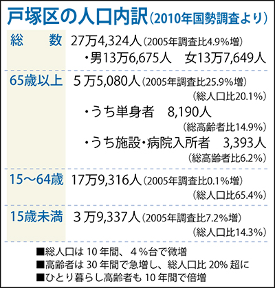 10月に発表された2010年国勢調査の集計結果により、戸塚区の高齢化率が初めて20%を超えたことが分かった。ひとり暮らし高齢者も大幅に増え、10年間で倍に。人口は4%台で微増を続けている。(反対面に関連記事)