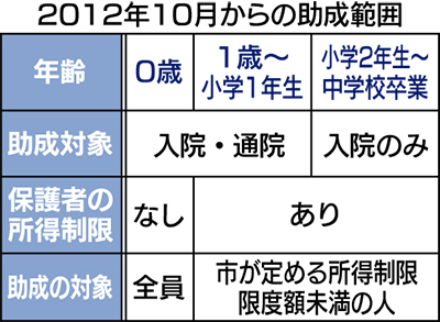 小児医療費助成は、健康保険加入の子どもが病気や怪我で医療機関を受診した際に支払う保険診療の自己負担分を、市が助成する制度。現在、0歳から小学校就学前までは入院と通院、小学生から中学生までは入院時のみ助成としている。