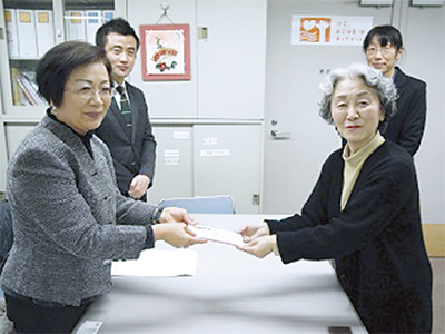 同ホームの山下夫美子施設長と山下信(まこと)事務長、大滝正雄理事が同協議会の事務所「フレンズ戸塚」を訪れ、山下施設長が有賀美代・同協議会会長に手渡した=写真。