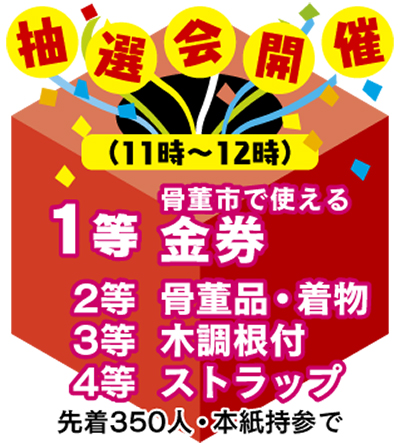 今回は、特別記念イベントでハズレなしの大抽選会も開催。本紙持参で先着350人限定につき、来場はお早めに。9時〜15時半(抽選会は11時〜12時)。入場無料。雨天決行。問い合わせは枡田さん【電話】090・3227・6995へ。