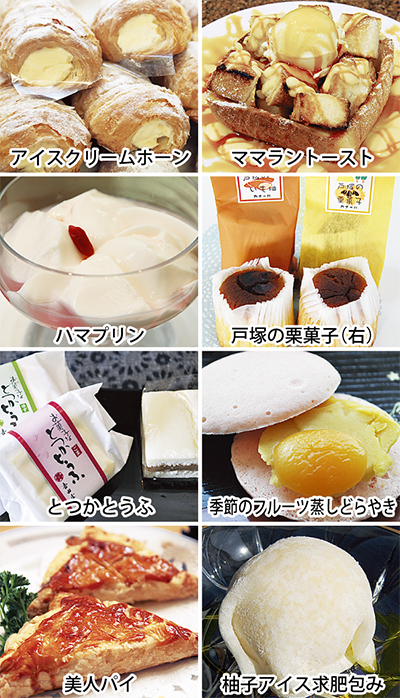 戸塚区からは8店が参加。「ぷちらぱん」の「アイスクリームホーン」は、人気商品「クリームホーン」のアイス版。カスタード味を始め4種から選べる。「花木蘭(ファムーラン)」の「ハマプリン」は、同店自慢の手作り杏仁豆腐に横浜市の花、バラのシロップを入れアレンジ。「吉田屋」の「とつかとうふ」は、ふんわりとした食感の焼き菓子。中に入っている甘さ控えめのあんはゆず味とごま味の2種類。「おこげとぎょうざ」の「美人パイ」は、中華版パイ生地の中に、白あんとカスタードクリーム、ライチ、カシューナッツが入っており、食感が売り。「自家焙煎コーヒー モネ」の「ママラントースト」は、ブランデーを染みこませたパンに、アングレーズとカラメルシロップ、アイスクリームを乗せた「大人な」トースト。「カナール」の「戸塚の栗菓子」は、栗の風味がしっかり伝わるようにと良質なバターをたっぷりと使った焼き菓子。「菓匠 亀福」の「季節のフルーツ蒸しどらやき」は、旬のフルーツ(今はマンゴー)とあんこをサンド。生地はマンゴーリキュールで香りづけ。「懐石ダイニングいおり」の「柚子アイス求肥包み」は、舞岡産の柚子を使ったバニラアイスを求肥で包んだ。
