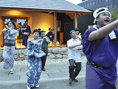 郡上おどりは岐阜県郡上八幡に伝わる伝統的な盆踊りで、盆の4日間、老若男女が踊り明かす。一足早い夏祭りに集まった参加者は過去最高の約150人。ライトアップされた夕暮れの境内は涼しげな浴衣姿の参加者でいっぱいになった。郡上八幡出身の若手囃子集団「郡上舞紫(ぶし)」の歌と演奏に合わせて、落ち着いた曲ではしっとりと、アップテンポな曲ではカラカラとげたの音を鳴らしながら激しく、様々な種類の踊りを辺りが暗くなるまで楽しんだ。