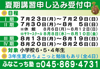 戸塚駅近くの学習塾「ふなこっち塾」では、夏期講習の申し込みを開始。また、今年も8月8日(水)から10日(金)までの2泊3日、サマースクールを行う。「旅行中、勉強は一切なし!!子どもたちが遊びたくなくなるまで、とことん遊びつくします」と船越塾長。