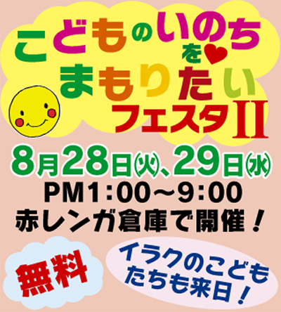 8月28日(火)、29日(水)には、みなとみらいの赤レンガ倉庫1号館で「こどものいのちをまもりたいフェスタII」を開催する。参加無料。イベントプログラムは両日ともに午後1時からと午後6時から約2時間。小児救命講習やイラクの子どものスピーチや交流会、同国の小児病院の院内学級教師の講演、福島支援の報告会、ピアノ演奏など。さまざまなNPOのブースやチャリティショップも並ぶ。