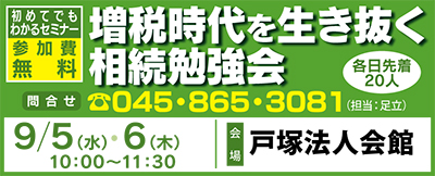 増税真っ只中の相続税、中身を知っているだろうか?最新の相続に関する動向を解説するセミナーが9月5日(水)・6日(木)に戸塚法人会館で開催される。当日は足立昌幸税理士とファイナンシャルプランナーの高橋成壽氏が講師を務める。