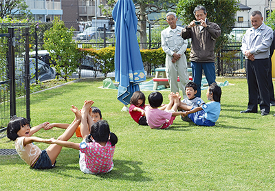 式典では同協会の岸本会長に感謝状が贈られ、園児たちが組体操を披露した。園庭一面に青く広がった芝生の上で、元気いっぱいに運動する園児の姿に同協会のスタッフらも笑みを浮かべていた。子どもたちは「芝生だと気持ちいい」「転んでも痛くないから、鬼ごっこがしたい」と飛び跳ねて喜んでいた。