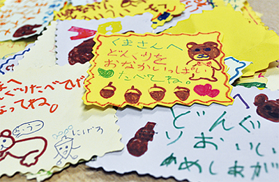 同学童に通う児童79人が9月から下校時や学童の活動中に集めたどんぐりは約20kg。「どんぐりたべてげんきになってね」「おいしいどんぐりをめしあがれ」などクマにあてたメッセージが添えられ、長野さんを介して会津若松市で野生動物保護などを行う一般社団法人「ふくしま いのちの森」が活動を支援する「くまんち」(田勢(たせ)美代子代表)に送られた。