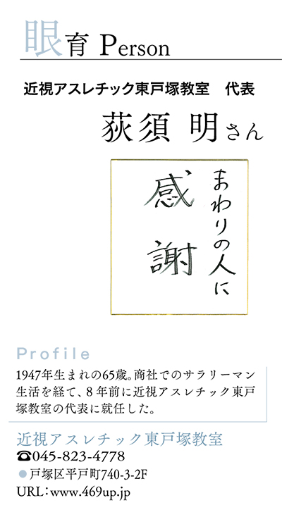 息子が小学生の時、所属する少年サッカーチームのコーチを務めていた。「子どもは学年を増すごとに、みるみる上達していく。それを見届けるのが楽しかった」。57歳で脱サラし、大好きな子どもに関わる仕事がしたいと同校の代表に就任。今も子ども達の視力が回復していく姿を見るのが喜びだ。「この地域から少しでも近視が減るように、これからも頑張りたい」
