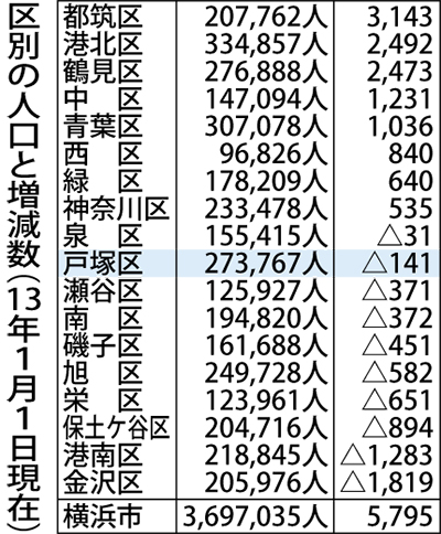 横浜市がこのほど発表した統計結果によると、12年中の人口増加数は5795人。戦後2番目に少なかった。地域別に見ると北部・都心臨海部の8区で増加、南部の10区で減少し、改めて「北増、南減」の傾向が浮き彫りとなった。また、65歳以上の高齢者は急速に増加、30年には100万人を突破する見込みだ。