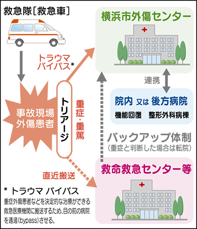 横浜市外傷センターは市の外傷診療の拠点として、交通事故や多発外傷などの重症外傷患者の救急搬送を集中的に受け入れる。