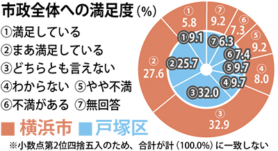 横浜市は市政や定住意識についてなど6分野の市民意識調査を実施し、このほど結果を公表した。「市政全体への満足度」について戸塚区民は、「満足しているほう」「まあ満足しているほう」の回答の合計が市内18区中6番目に高い34・9%(市全体33・4%)、「不満があるほう」「やや不満があるほう」の計17・1%のおよそ2倍となった。