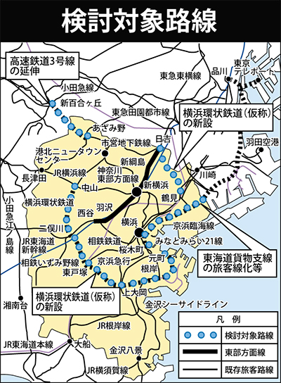 同調査の検討対象は、【1】高速鉄道3号線(市営地下鉄3号線)あざみ野〜新百合ヶ丘の延伸、【2】横浜環状鉄道・仮称の新設(日吉〜鶴見、元町・中華街〜根岸〜二俣川〜中山)、【3】京浜臨海線(東海道貨物支線の旅客線化等、桜木町〜品川など)の3路線。中間報告は30年を目標年次に需要規模の推計や収支採算性などについて試算したもので、市の将来人口動態や移動特性の変化も想定した。