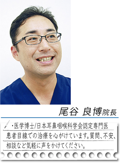 「春のスギ花粉やハウスダスト、これからの季節はダニによる鼻炎にも要注意」と話すのは区内原宿のおたに耳鼻咽喉科の尾谷良博院長。そこで同医院が推奨しているのがレーザー治療だ。眠気などの副作用がなく、妊娠、授乳中の人でも施術できるこの治療法は、鼻の粘膜にレーザーを当て、アレルギーを起こす部分を焼灼するもの。治療自体はおよそ20分〜30分。麻酔もガーゼによる塗布ですむ。さらに尾谷院長によると「発症前から治療を続けると2〜5年、人によっては10年程度効果が続く。有効性は80〜90%と言われます」という。スギなど季節ごとの症状がある場合は先手が有効とのことだ。症状がない今は意識が薄れてしまうが、今が肝心とも。「様々なアレルギーにお悩みの方は気軽に専門医に相談してほしい」
