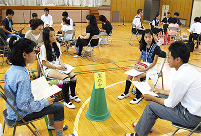 議論の場では中学校ブロックを基本に7グループに分かれ、中学生を進行役に積極的に意見を交換した。