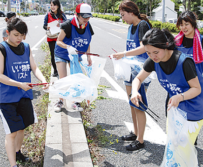 当日はアメフト部と小学生チームのリトルセインツ、学生団体、下倉田町内会、小松ヶ丘自治会、富士ヶ丘チーム、幸ケ丘自治会から約180人が参加。登録チームごとに約1時間キャンパス周辺をごみ拾いし、量と質を競い合った。あるチームは車道の中央分離帯を中心に活動=写真。「車から捨てられたタバコのごみが多い」と話していた。