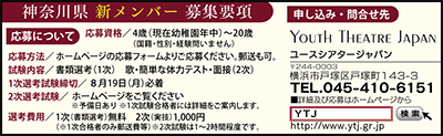 10月からレッスン(週1回2時間)に通える、4歳(年中以上)から20歳の男女を募集中。1次は書類選考。YTJのホームページの応募フォームか郵送で申し込むことができる。8月19日(月)必着。合格者は2次の実技試験へ招待され、歌と体力テスト、面接へ進む。