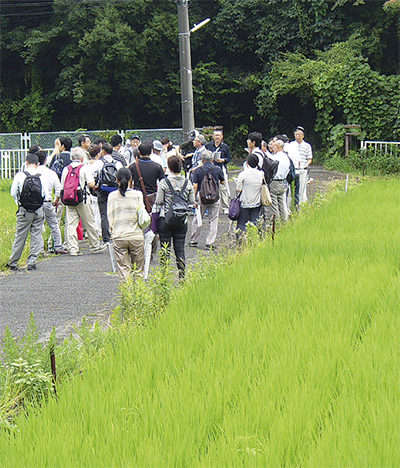 市が掲げる横浜みどりアップ計画の一環として農地を守る取り組みが進められている舞岡ふるさと村の調査と意見交換が8月1日、市民ら約40人によって行われた。