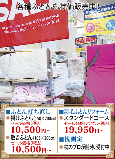 78周年の老舗、各種ふとんを売出し中のトミヤ寝具店では、プロの手による「快眠」3大企画を特価で開催している。9月30日(月)まで。