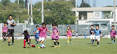 「サッカーでは相手をだますことを『フェイント』と言います」など、同スクールのコーチ陣が学年ごとに分けたクラスで技術を解説。最後はミニゲームで盛り上がった。同コーチの伊藤昭朗さんは「いずれ東戸塚からプロや世界を目指す子が育ったらうれしい」と話していた。