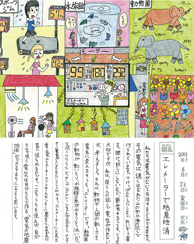 テーマは「みんなで環境未来都市について考えよう」。安室さんは1カ月にわたって構想を練り、動物や魚の動きを電気に変える装置「エレメーター」を考案。身近な場所で安全に電気を作る仕組みを描いた。