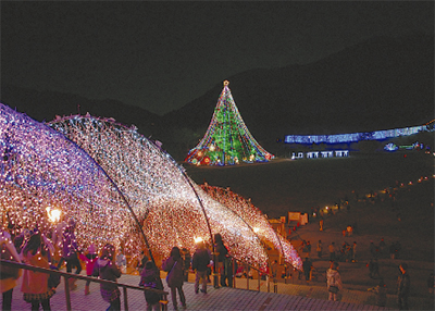 会場の宮ヶ瀬湖畔園地は山と湖に囲まれた場所。周囲にネオンや照明はほとんどなく、闇夜に浮かぶ約70万個の電飾の美しさを純粋に楽しむことができる。長さ315mの大つり橋、高さ30m超の自生モミの木ジャンボツリー、光のトンネルと見どころ、フォトスポットはいっぱい。園地内を特別運行中のロードトレインもおすすめだ。