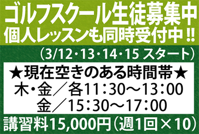 現在3〜6月期のスクール生を募集中(表参照)。各クラス10人の少人数編成でPGAティーチングプロA級の講師が基本に重点を置いて丁寧に指導してくれるため、初心者にもおすすめ。ショットの不調など個々の悩みにも応じてくれる。時間帯により若干の空きあり。予約はお早めに。