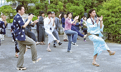 明治学院大学の大学祭「戸塚まつり」に合わせて、同大の教養教育センターが主催し、実施している毎年恒例の企画。講演やおどりのレクチャーのほか、物産展なども行われた。夕方になると善了寺には、浴衣姿の大人や法被姿の子どもがぞくぞくと集合。境内から聞こえてくる音楽につられて、立ち寄った人の姿も。踊り慣れていない参加者には、郡上踊りの踊り手が手本を見せながら動きを一つひとつ指導した=写真。