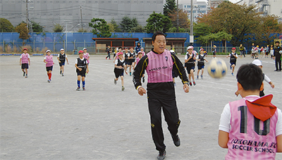 その後グラウンドでは男女別でサッカー教室が開かれた。奥寺さんの他にも男子は横浜FCの小野瀬康介選手と高丘陽平選手、女子は横浜シーガルズの田中景子選手と山本絵美選手が授業に加わり、デモンストレーションなどをして授業を盛り上げた。