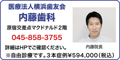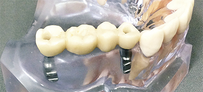 ブリッジは、ジルコニアという金属に近い強度をもつ白い物質を院内で加工している。同院では、骨のある人にのみ、手術をしており、少ない人には行わない方針。「入れ歯がどうしても嫌だという方は、ご検討ください。インプラントブリッジはもっと大きな症例にも対応できます」と内藤院長。