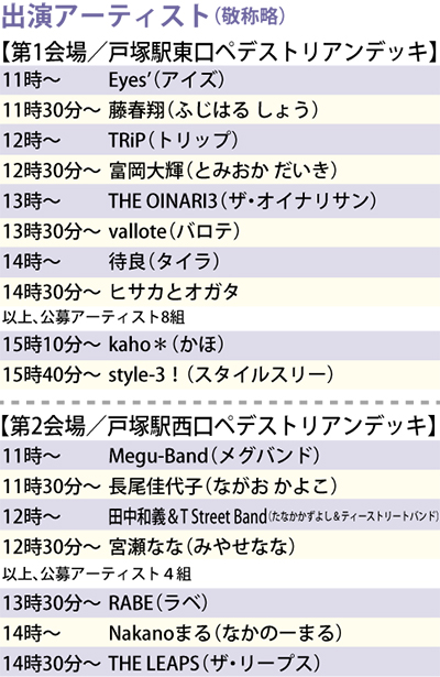 とつかストリートライブは、戸塚区の「とつか音楽の街づくり事業」の一環として戸塚駅東口及び西口ペデストリアンデッキで実施するストリートライブ。出演アーティストのうち14組は、区内や隣接市区で音楽活動を行うグループ・ソロから、イベントの主催団体でもある同運営委員会が審査・選考した。同運営委員会は地元商店会や企業、NPO法人、区役所地域振興課等で構成されている。