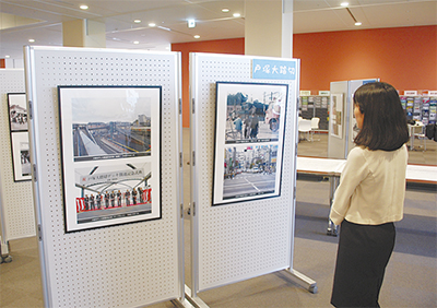戸塚アンダーパスの開通を記念して戸塚駅周辺の変遷をたどるパネル展が、区役所3階区民広間で開催され=写真、庁舎に足を運んだ区民らの目を楽しませている。3月30日(月)まで。