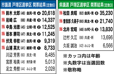 第18回統一地方選挙の横浜市議・神奈川県議選挙が4月12日投開票で行われ、戸塚区では市議6氏、県議3氏が決定した。トップ当選はそれぞれ自民党の鈴木太郎氏(48歳/4期)・松田良昭氏(62歳/8期)。
