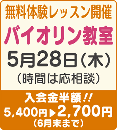 「ちょっと敷居が高くて」。そんなイメージもあるバイオリンをアットホームな雰囲気の「ハマヤ楽器戸塚西口センター」にて参加無料で気軽に体験できる。日時は5月28日(木)。(時間は応相談)レンタル制度有り。