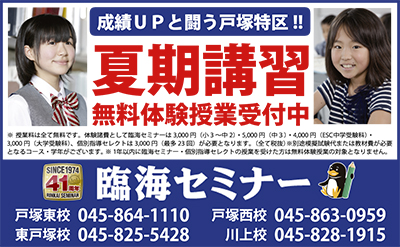 地域密着の大手進学塾、臨海セミナー戸塚区内4校(戸塚東・戸塚西・東戸塚・川上)では「成績UPと闘う戸塚特区」と銘打ち、点数アップや成績アップと、その先の志望校合格を強力に支援している。各教室長の強い要望で組織された「戸塚特区」で、全ての中学生を対象に導入しているのが「成績UP特割」。入塾してから学校の成績が上がると授業料が割引に。主要5科目の成績が1上がれば月2000円、5上がれば10000円割引となる。