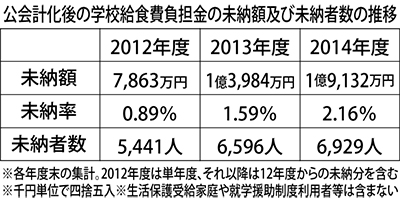 一方、各学校からの報告をまとめた公会計化前の未納額は09年度が約3500万円、10年度約2900万円、11年度約2600万円(いずれも単年度集計)と、減少傾向にあった。