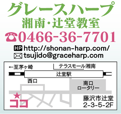 そう話すのは、辻堂駅西口徒歩1分のハープ教室の小坂先生。同教室ではさまざまな大きさのハープを取り扱っている。入会金は6千円、レッスンは40分/4千円で月2回から通えるので無理なく続けられる。