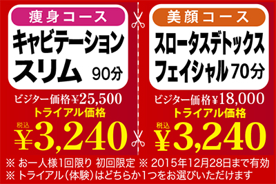 ビューティーリバースの痩身人気ナンバー1コース「キャビテーションスリム」は、サイズダウンとセルライトの分離・分解に効果を発揮する。頑固な脂肪の塊を40キロヘルツの超音波で乳化させ、「メスを使わない脂肪吸引」と呼ばれるRCローリングと、プロの手技でしっかりとリンパに流す90分。蓄積した脂肪を燃やし、気になる部分をすっきりさせて新年を迎えよう。