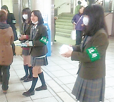 改札口付近で同高生徒が作成したイラストを入れたマナー啓発のためのティッシュを道行く人に配布した。
