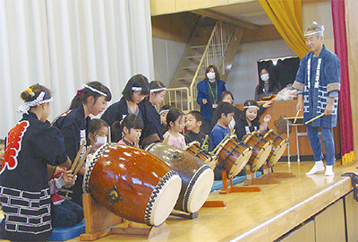 講師を務めたのは、汲澤囃子連の石井徹さん。石井さんと同団体でお囃子を習っている同校在校生12人による演奏が終わると、児童はいよいよお囃子を体験した。演奏では同団体の児童が、在校生に丁寧に太鼓のたたき方を教える場面も=写真。伝統芸能に触れただけでなく、互いの交流の場にもなった様子だった。