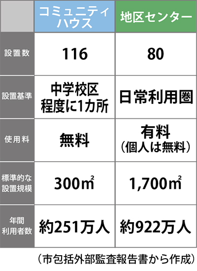 市内地区センターを利用する市民団体は「近くにコミハがなく不公平感はある。借りるのに利用者が負担するのは自然なことだと思う」との見方を示した。地区センターなどを管轄する市民局地域施設課の担当者は「地区センターとコミハは、設置目的が違うが、精査していく」と話している。