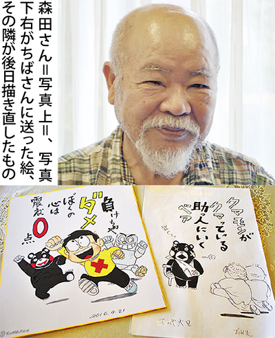 「横浜からは遠いし年寄りで力仕事はできない。だけど絵は描ける」――。熊本県のPRキャラクター・くまモンを描くと、「クマモンがクマっている」と生業のギャグを添え、仲間のちばてつやさんへ送った。2人の間でよく交わされるやりとりのつもりで、きちんと確認をせず描いたくまモン。ちばさんが自身のブログで公開すると、森川ジョージさんがくまモンの絵で熊本を励まそうと漫画家に呼びかけ。「くまモン頑張れ絵」としてツイッターを中心に、たちまち全国に広まった。「後日、著作権表示をつけて描き直した」と森田さんは照れ笑う。これらの予想外の広がりに熊本県は、イラスト利用の特例措置を出している。