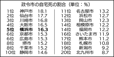 在宅医療の取り組みが進む中、厚生労働省が7月、自宅で死を迎える「自宅死」の割合について、市区町村別の統計を初めて公表した。自治体間の格差が明らかとなり、横浜市は16・3%で全国平均の12・8%を3・5ポイント上回った。全国20政令市で5番目に高かった。