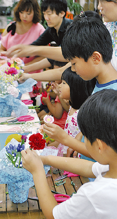 グリーンファーム(汲沢町)で9月3日に開催された夏祭りで、花育をテーマに切り花アレンジ体験が行われた。当日は約20人が参加。この取り組みは、子どもたちに花に触れる機会を提供しようと約3年前から毎月行われている。