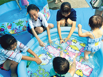 水遊び会には、豊田中学校の生徒11人がボランティアとして参加し、ペットボトルから手作りしたおもちゃで、水をかけ合うなどしながら楽しんだ。