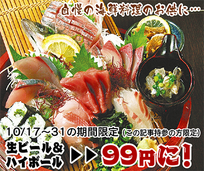 港直送の朝獲れ素材が自慢の「茅ヶ崎海ぶねトツカーナ店」で生ビールとハイボールを”一杯99円”で振る舞う大特価フェアをTN(タウンニュース)読者限定で実施する。期間は10/17(月)〜31(月)まで(フェアは昼夜問わず)。