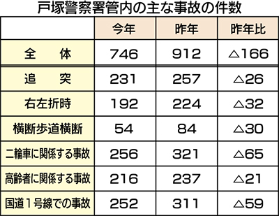 戸塚警察署管内で今年1月から11月末日までに起きた人身交通事故件数が発表され、昨年より2割弱減少したことがわかった。交通事故の多い年末に向け、同署をはじめ関係機関は事故防止を呼び掛けている。