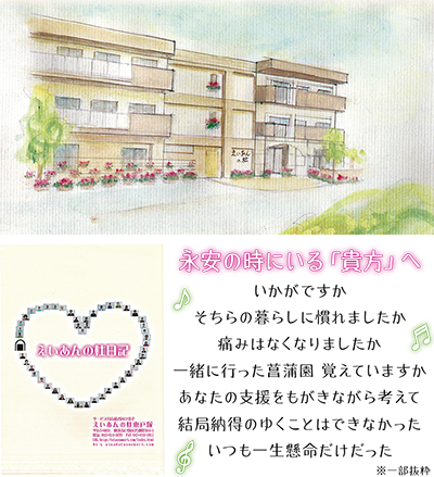 同施設は、介護職員が開所してからの4年間の日々を綴ったブログをまとめた冊子「えいあんの杜日記」を完成させた。冊子には、和気あいあいとした季節ごとのイベントの様子や、入居者に接する介護職員の喜びや葛藤などが率直な言葉で書かれている。
