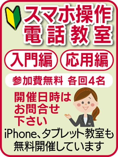 同店では大好評の「スマホ教室」(参加無料)を開催中。画面設定やネット検索などの基本操作から、便利なアプリ、LINE、カメラの使い方まで何度でも教えてもらえるので、購入後も安心だ。詳細は【電話】を。