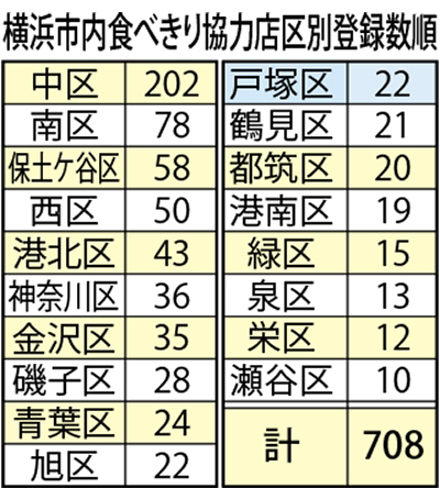 特に力を入れるのが飲食店への周知。市は12年度から小盛りメニューや持ち帰りなどに対応している飲食店を「食べきり協力店」として認定。3月31日時点で708店が利用可能な店として登録している=表。市内には飲食店や宿泊業が約1万5000店あり、同局は登録件数を増やしたい考えだが、料理の量をサービスとして営業している店など、食品ロスに対する考え方はさまざまで、あくまで個別に登録を呼びかけるほかなく、難しい面もある。