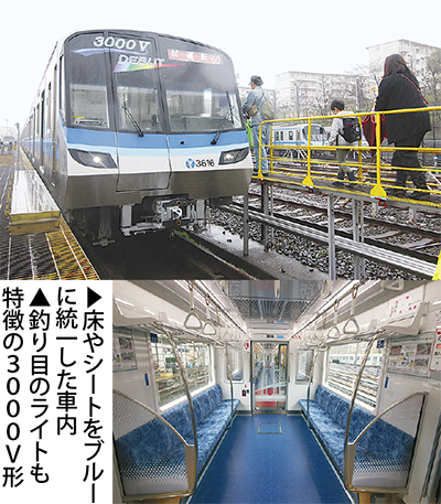 市営地下鉄のブルーラインで11年ぶりとなる新型車両「3000V形」が4月9日に運行を開始した。寸法や主な性能は従来の3000形を踏襲しつつ、ワイド型液晶パネルを設置して他社運行情報や4カ国語(英・中・韓)での次駅表示を導入するなど内装面を一新。また床とシートをブルーに統一し、仕切を透明にするなど明るい内装となった。導入されたのは1編成で、市営地下鉄の運行体制は計38編成となった。